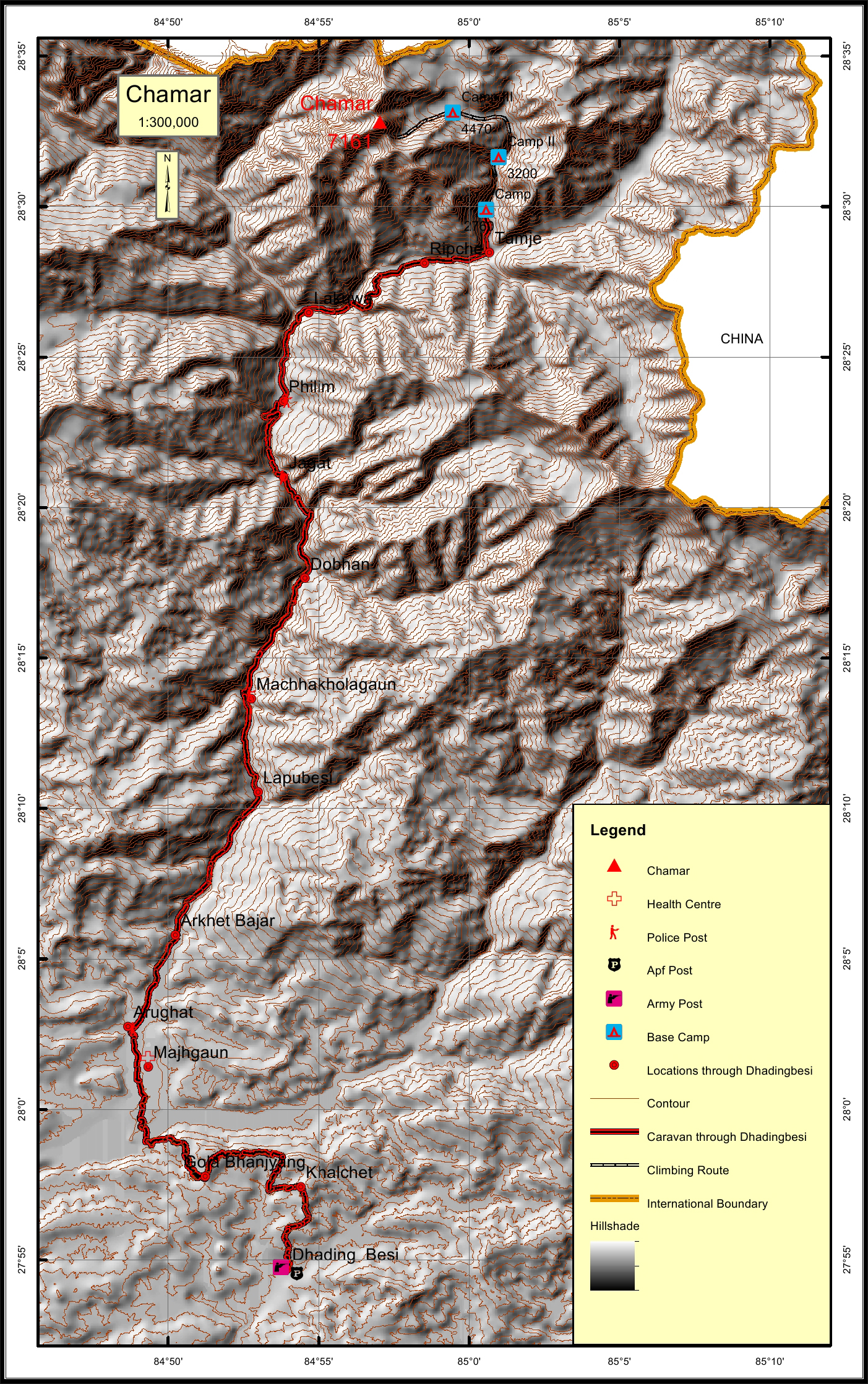 Chamar is the highest peak of the Sringi Himal, which is a sub-range of the Nepalese Himalayas. It is located in the North Central Region of Nepal, just south of the Tibetan border between the Shyar Khola on the east and the Tom Khola-Trisuli Gandaki Valley on the west. This peak is about 90 km northwest of Kathmandu, and 25 km east of Manslu, the nearest eight-thounsander. It is about 26 km away from Ganesh Himal and 32 km from Himchuli peak.